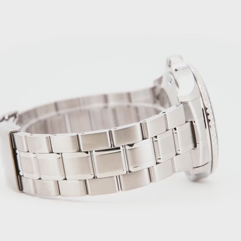 Un diver classico con due interpretazioni: indici tondi essenziali oppure grandi numeri arabi che accendono il carattere sportivo. Lunetta scanalata a forte presa, quadrante pulito con finestra day-date e lancetta dei secondi a punta colorata rendono la lettura immediata. Al polso, bracciale in acciaio dal taglio deciso o cinturino in gomma per un’impronta più dinamica. Un’estetica solida, disegnata per l’uso quotidiano e capace di attraversare stili e stagioni.
