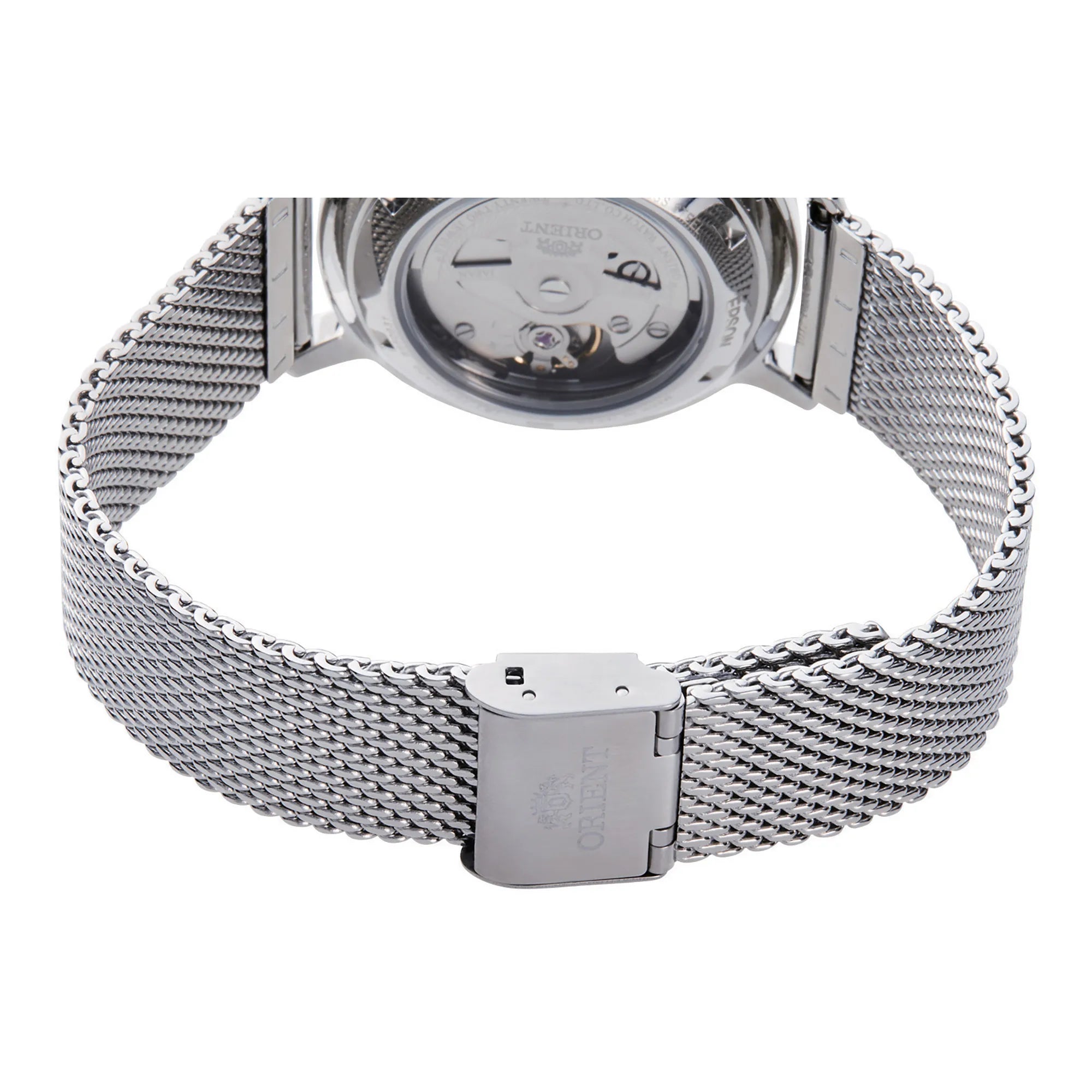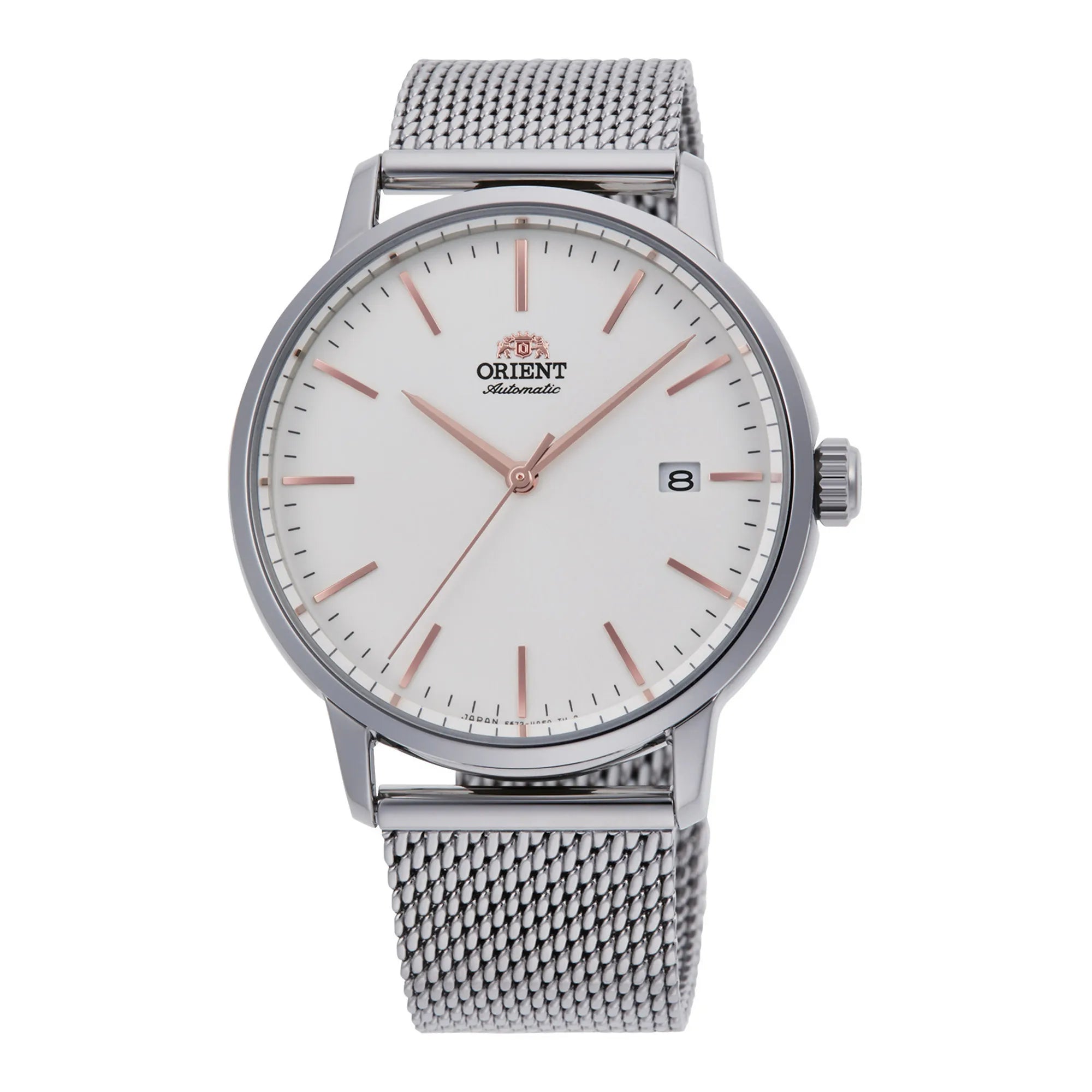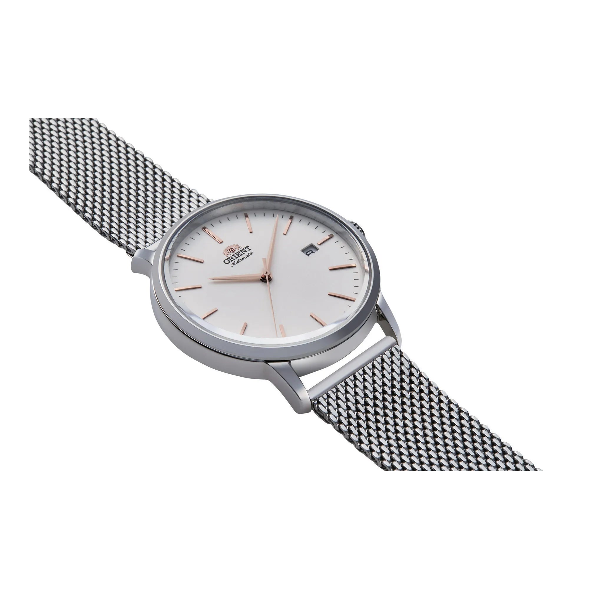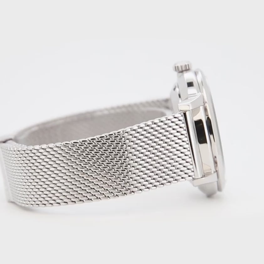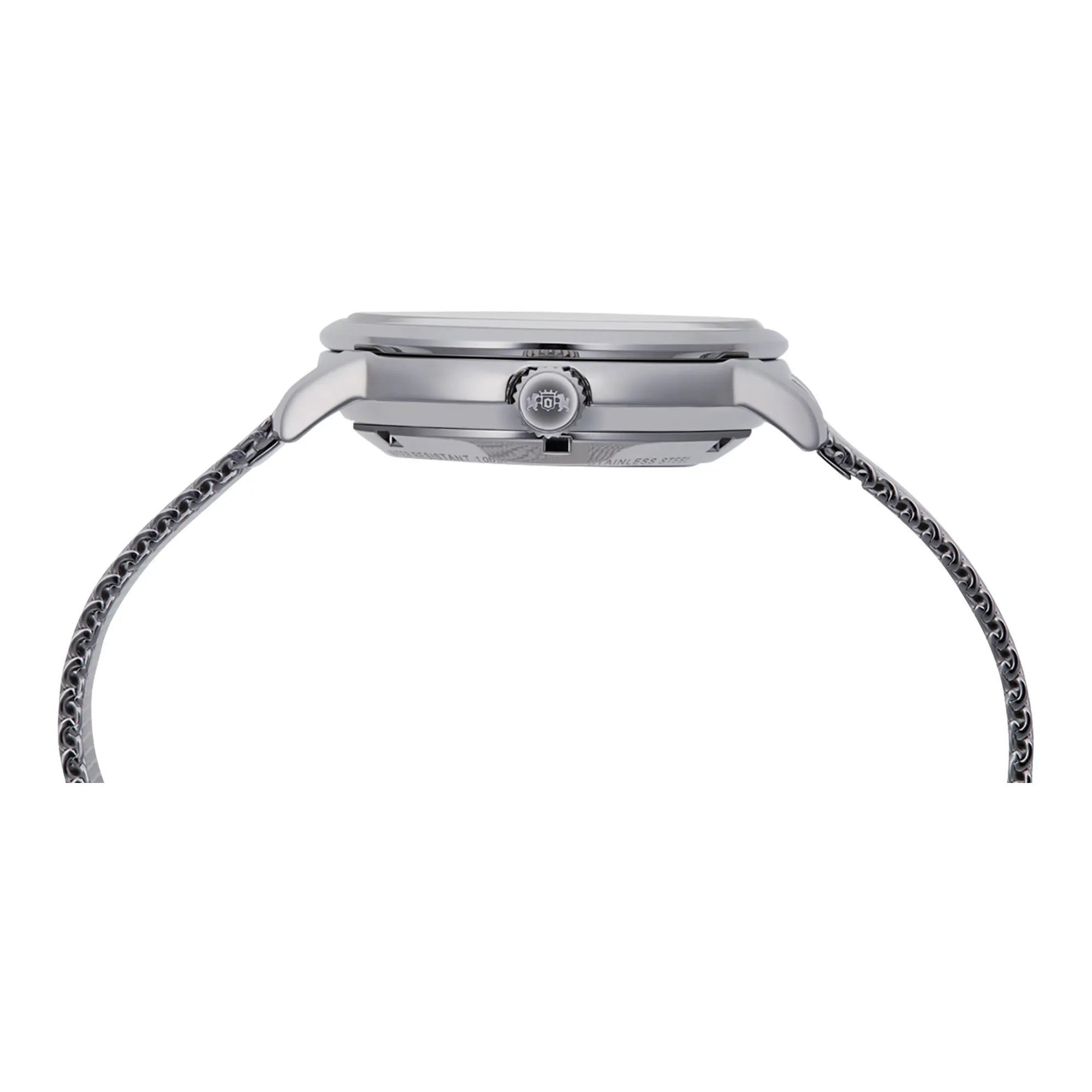 Questo moderno orologio meccanico automatico a carica manuale e dalla livrea sofisticata ma minimale è un accurato incontro di funzionalità e design che si rivela comodamente indossabile e versatile giorno dopo giorno. Qui in versione con bracciale a maglia milanese e quadrante bianco.