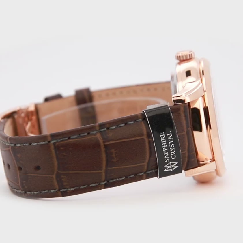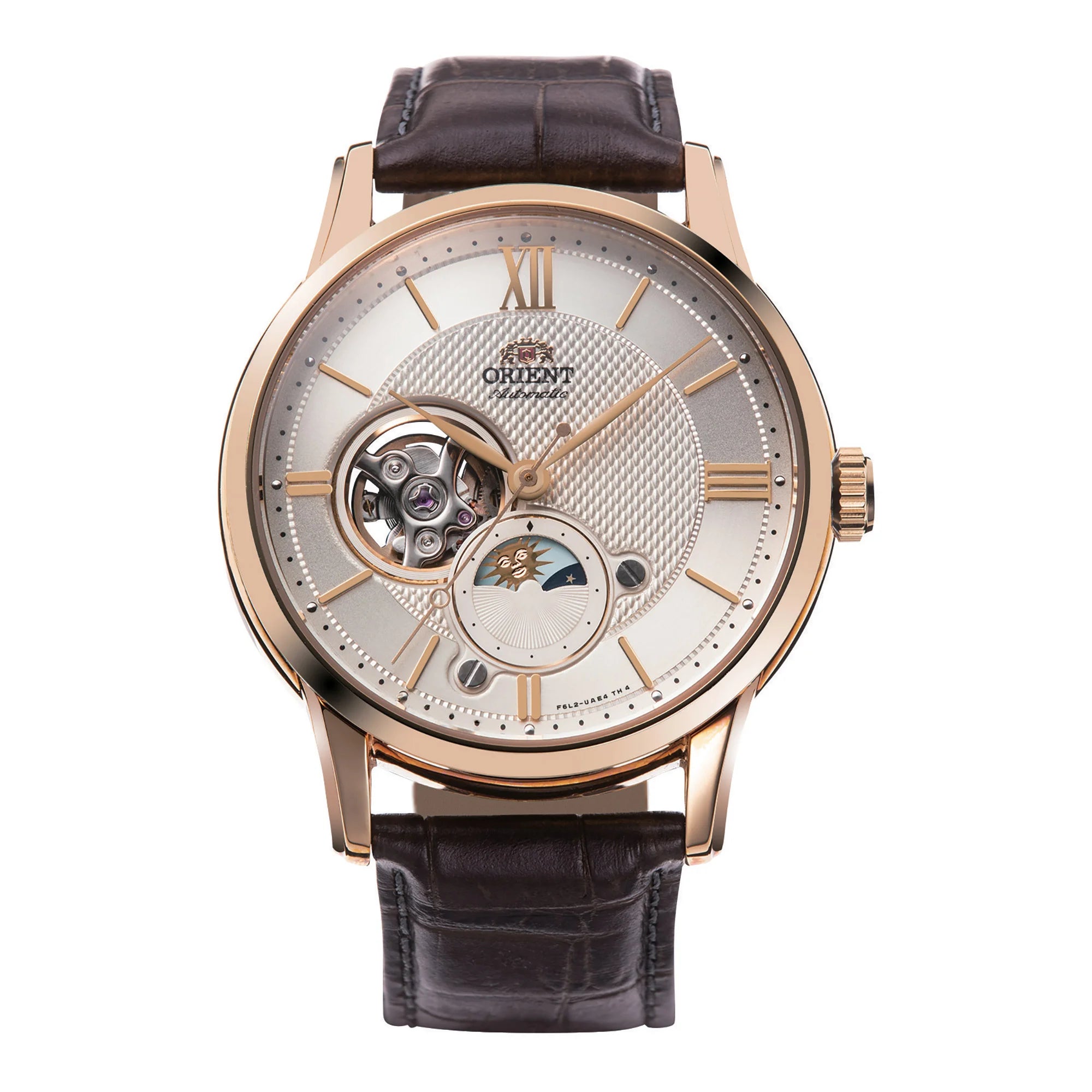 Splendida novità nella famiglia ORIENT Classic dalla cassa sottile, il vetro bombato e un calore vintage dallo stile semplice e di personalità, questo elegante segnatempo Sun & Moon presenta, accanto al riconosciuto semi-scheletro tanto amato dagli appassionati, un disco rotante che segna per 24 ore il passaggio dal giorno alla notte.