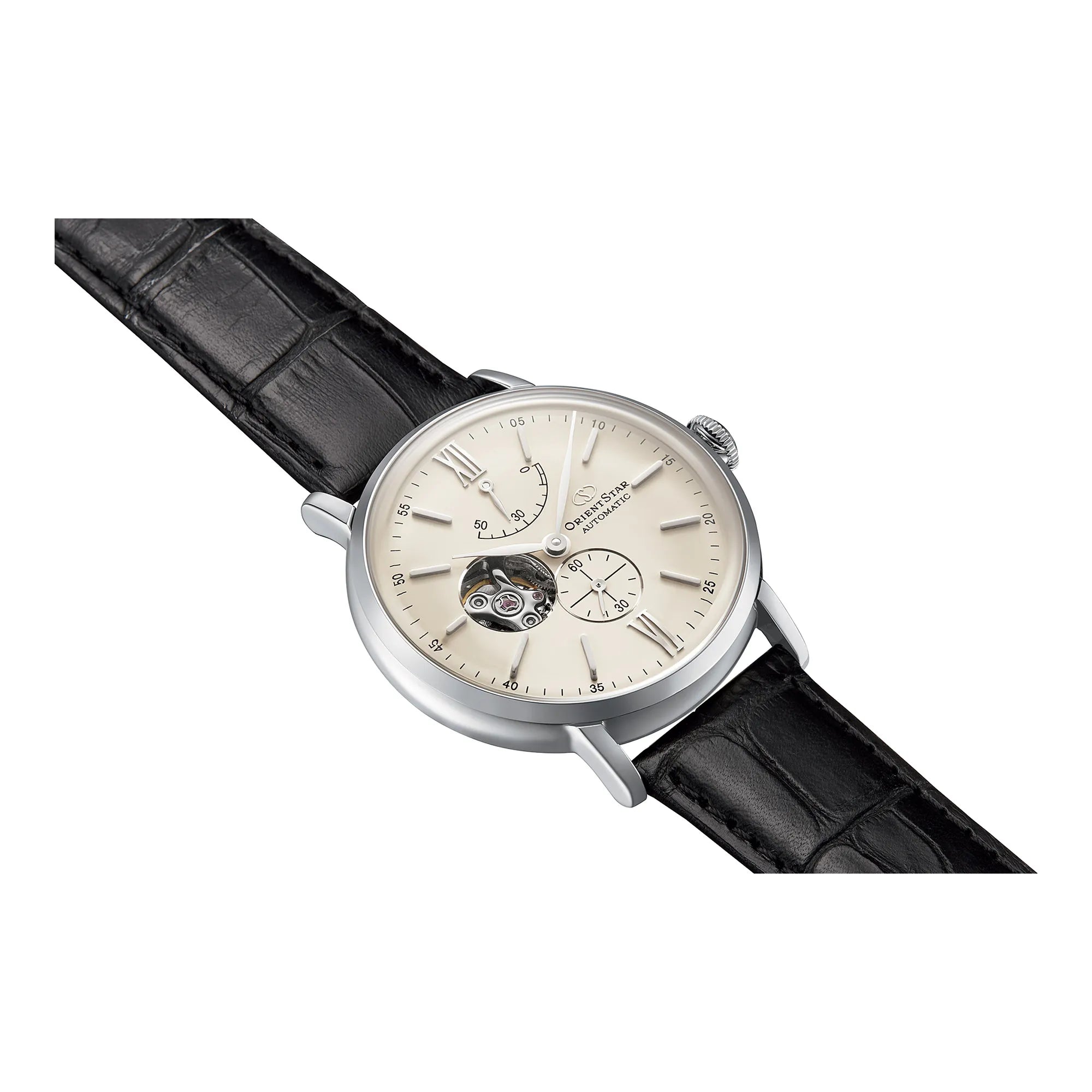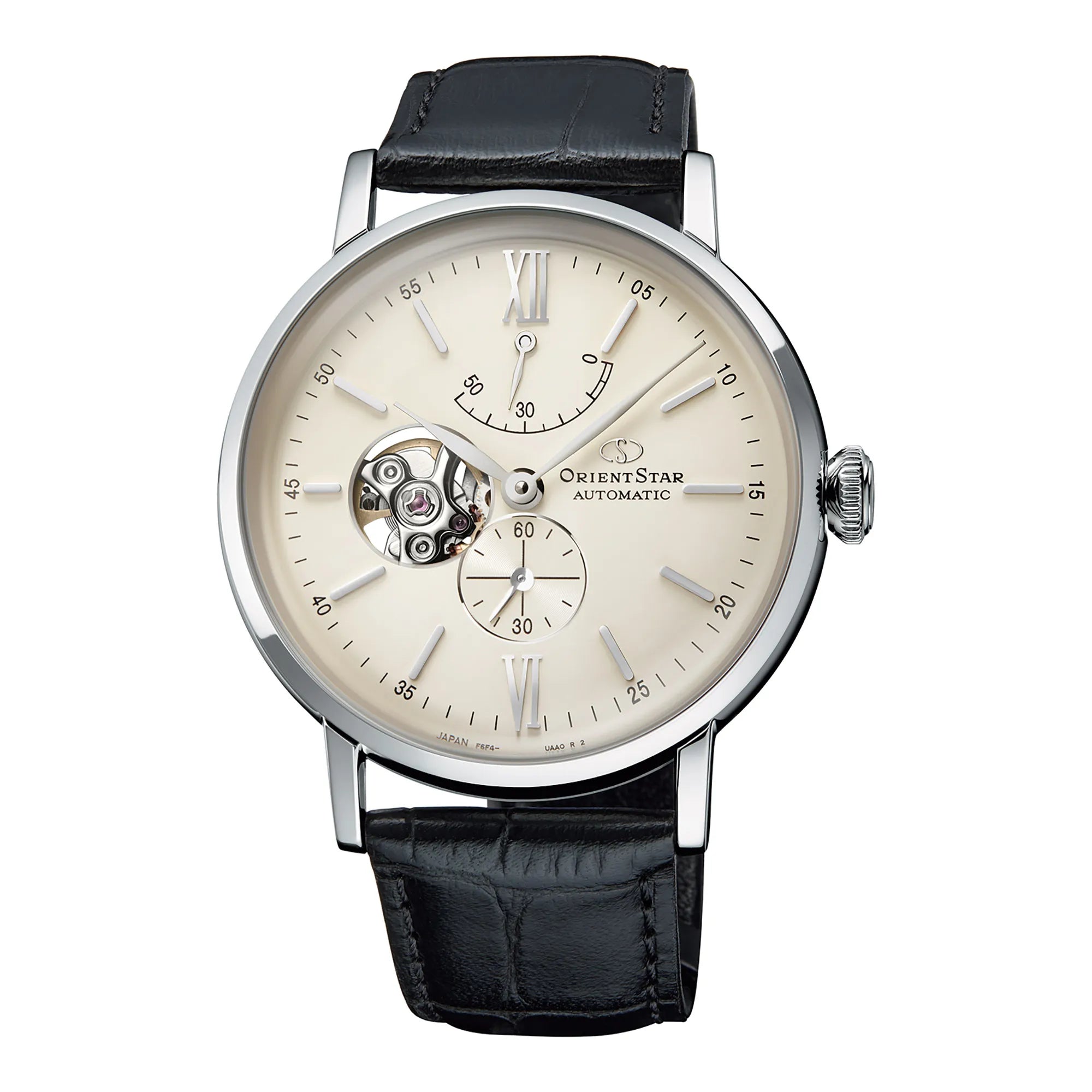 Questo segnatempo ORIENT STAR Classic vive di un perfetto equilibrio di proporzioni tra cassa, anse e bracciale. Completano l'estetica una vista semi-scheletrata del quadrante e due volantini per la riserva di carica ed i secondi. Indici eleganti con numeri romani ad ore 12 e vetro zaffiro antiriflesso rendono perfetta la composizione complessiva dell'orologio. Qui in versione in pelle nera e quadrante beige.