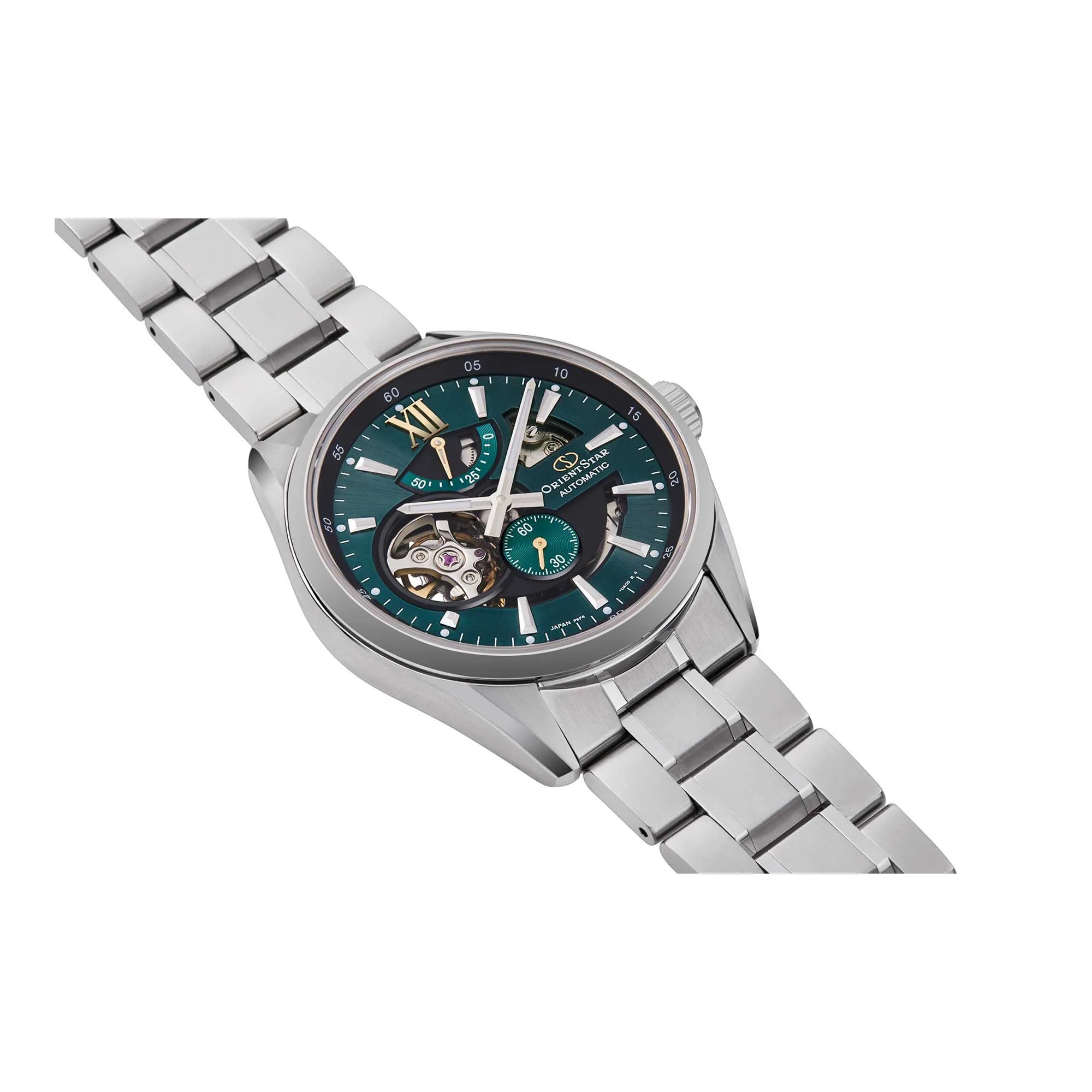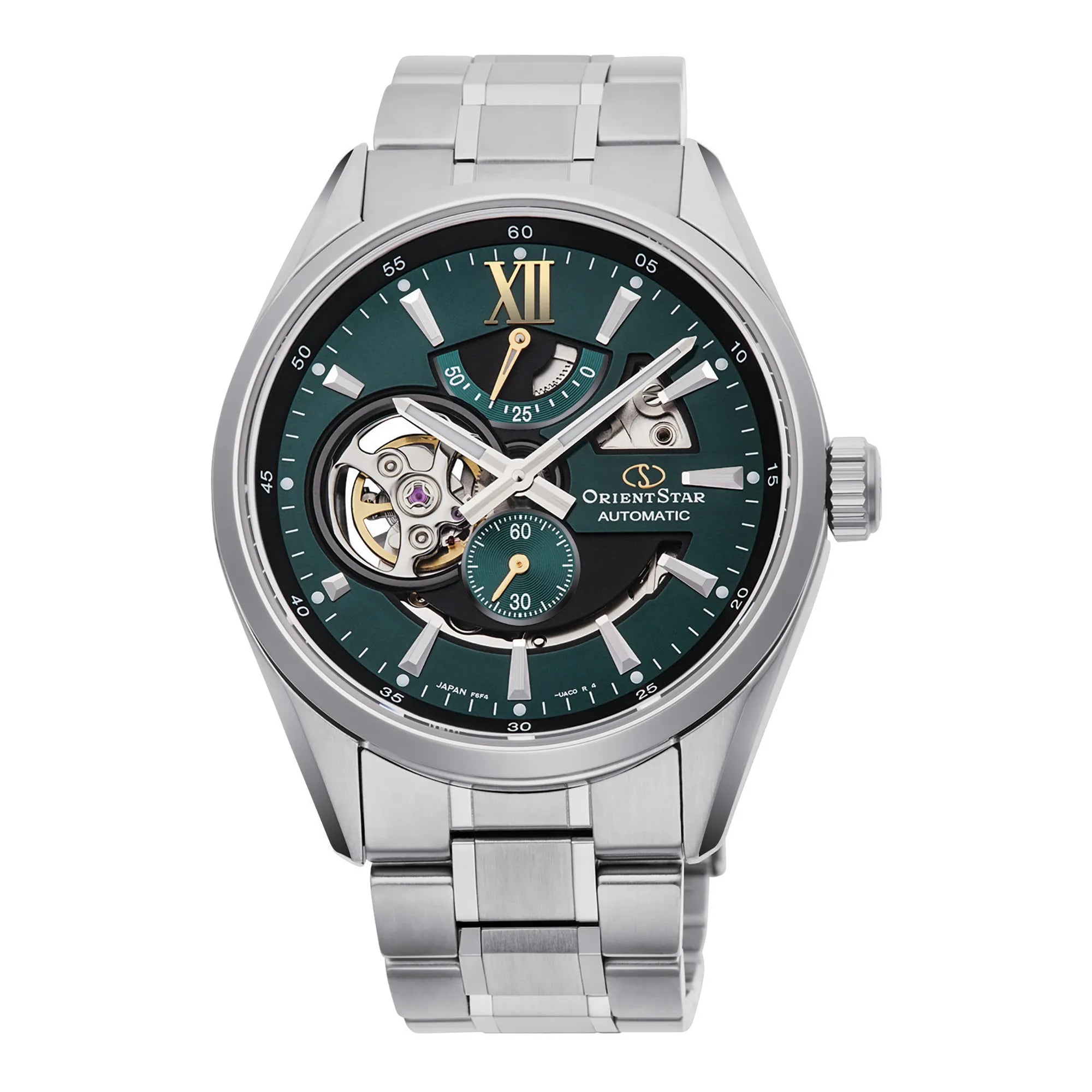 Scheletratura come segno distintivo: ponti a vista e bilanciere in movimento costruiscono una scena dinamica. Indici applicati e lancette dal profilo netto mantengono ordine e leggibilità, mentre la minuteria perimetrale guida lo sguardo tra i diversi livelli del quadrante. Finiture alternate e lavorazioni a raggiera amplificano i giochi di luce. Vetro zaffiro e fondello trasparente sottolineano la cura costruttiva. Bracciale in acciaio o cinturini in pelle, secondo le varianti. Equilibrio tra tecnica esibita ed eleganza quotidiana.
