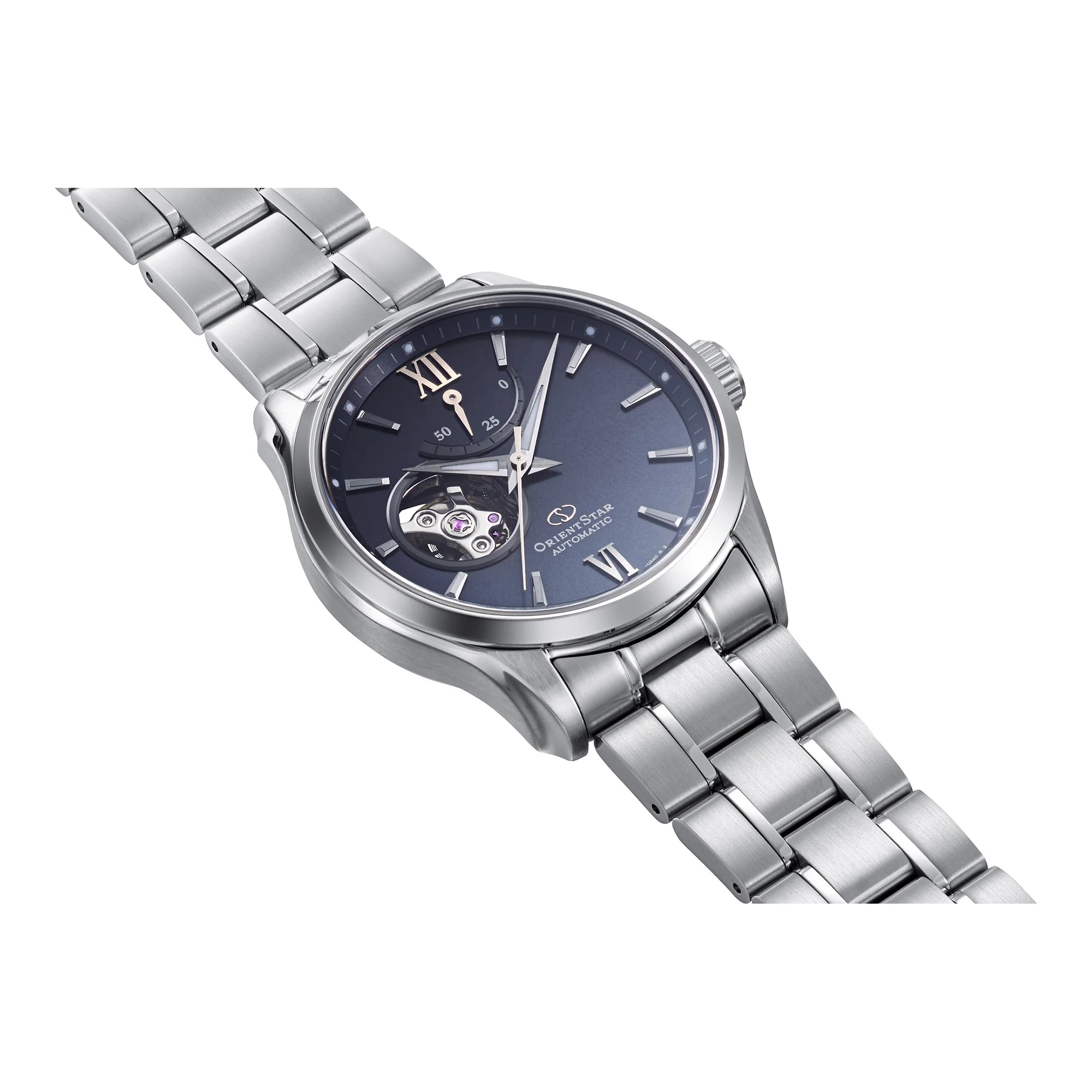 Anima meccanica a vista in chiave contemporanea: l’apertura sul lato sinistro del quadrante mostra il bilanciere, mentre l’indicatore di riserva di carica in alto aggiunge funzionalità e ritmo visivo. Il disegno a più livelli con finiture radiali crea profondità e mantiene ordine, con indici e lancette trattati Luminous Light per una lettura chiara. Vetro zaffiro con trattamento antiriflesso e fondello trasparente sottolineano la cura costruttiva;i cinturini in pelle completano un’estetica elegante ma decisa.
