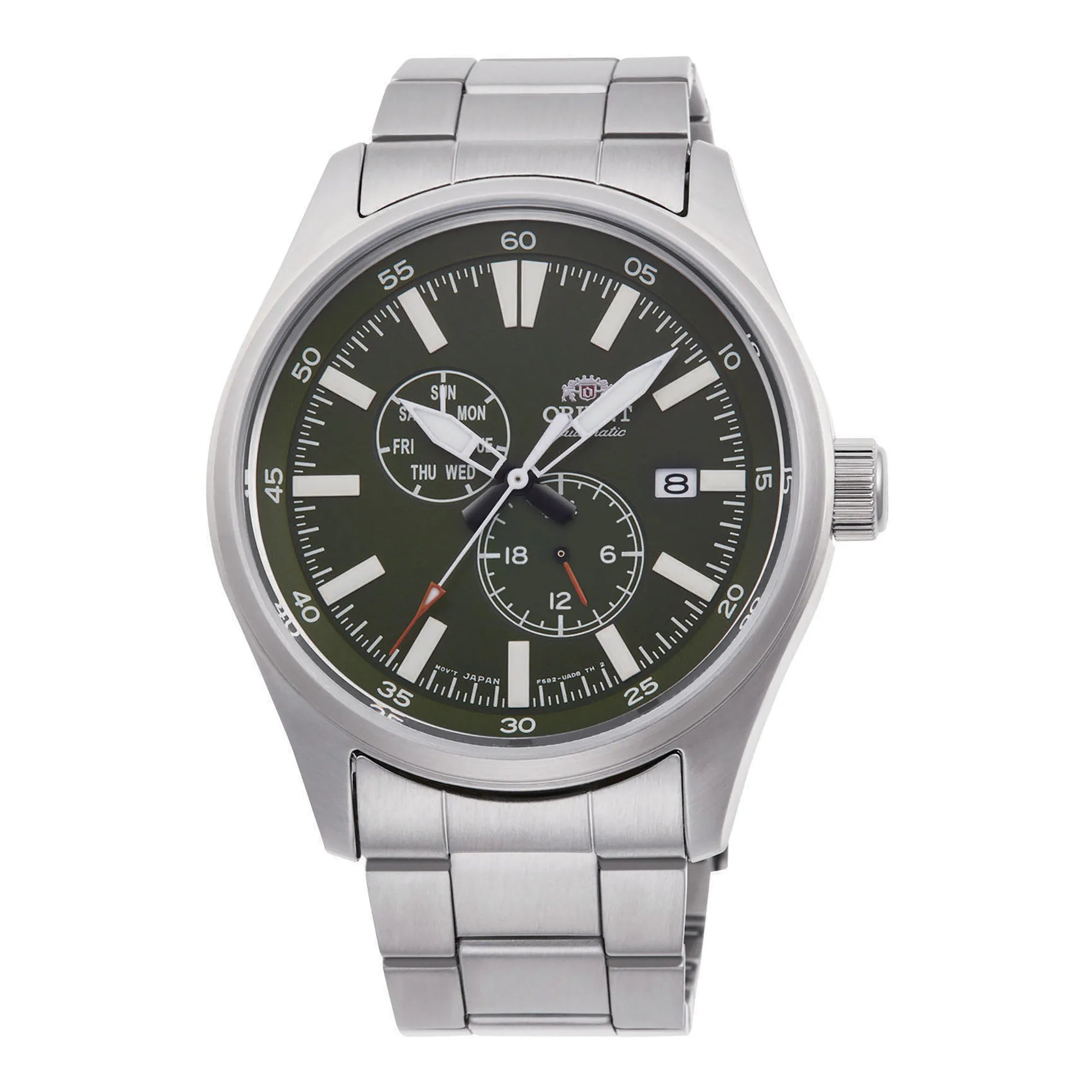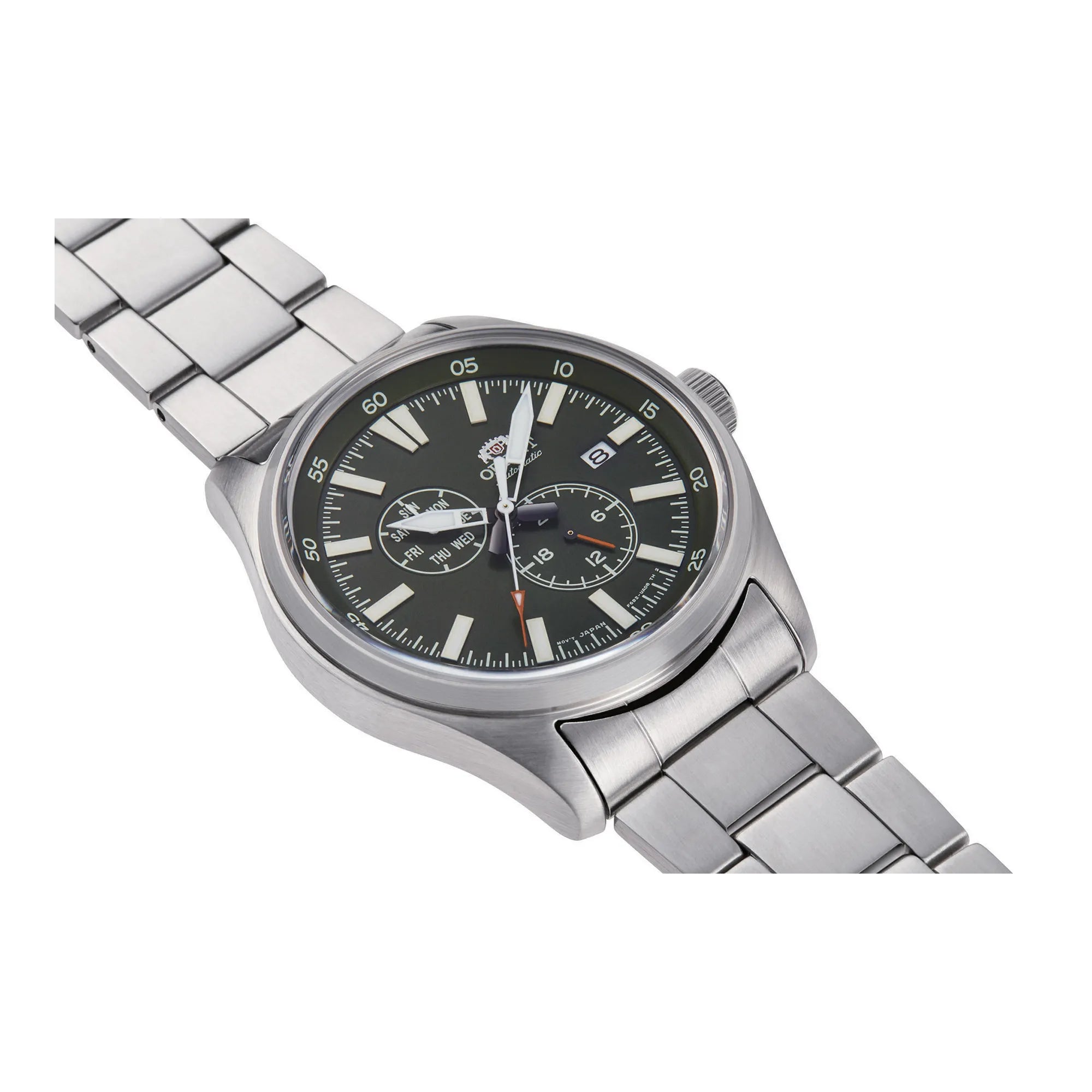 Scopri la collezione ORIENT Sports, sinonimo di affidabilità e stile per l’uomo contemporaneo. Ogni orologio ORIENT unisce tradizione e innovazione, offrendo segnatempo solidi e curati nei dettagli. Questo modello, ispirato alla serie Field, è pensato per chi desidera un compagno preciso e resistente, adatto tanto alle attività quotidiane quanto ai momenti di relax. Al suo interno è equipaggiato con il movimento meccanico automatico ORIENT Calibro F6B22. Dotato di 22 rubini, offre una precisione stimata di +25/-15 secondi al giorno. Dispone di carica automatica, possibilità di carica manuale e funzione hacking per una regolazione dell’ora accurata. Il quadrante presenta tre lancette e l’indicazione di giorno e data, funzionalità pratiche per l’uso quotidiano. La cassa in acciaio inossidabile, dal diametro di 43 mm e spessore di 12 mm, conferisce al modello una presenza solida e bilanciata al polso. La resistenza all’acqua è garantita fino a 100 metri (WR 100mt), grazie alla corona e al fondello a vite che proteggono il movimento interno da infiltrazioni. Il vetro minerale, resistente agli urti, salvaguarda il quadrante, mentre gli indici e le lancette trattati con materiale luminescente assicurano una buona leggibilità anche in condizioni di scarsa illuminazione. Il cinturino è dotato di chiusura deployante con pulsante, per una vestibilità sicura e confortevole. Questo orologio da uomo combina la resistenza tipica di un modello sportivo con un’estetica sobria e versatile, adatta a ogni occasione. Un segnatempo automatico affidabile e ben progettato, ideale per chi cerca funzionalità, qualità costruttiva e uno stile essenziale ma distintivo.