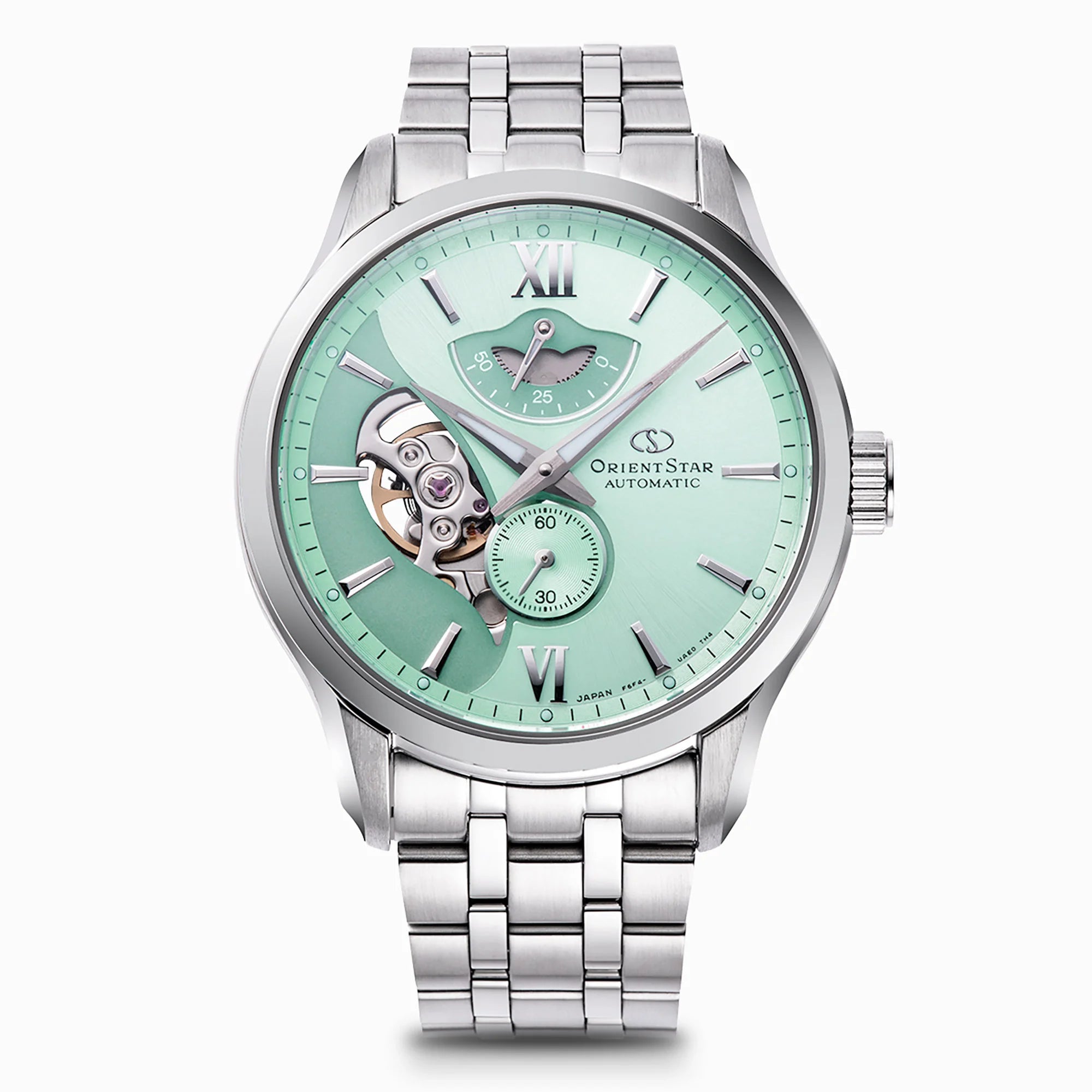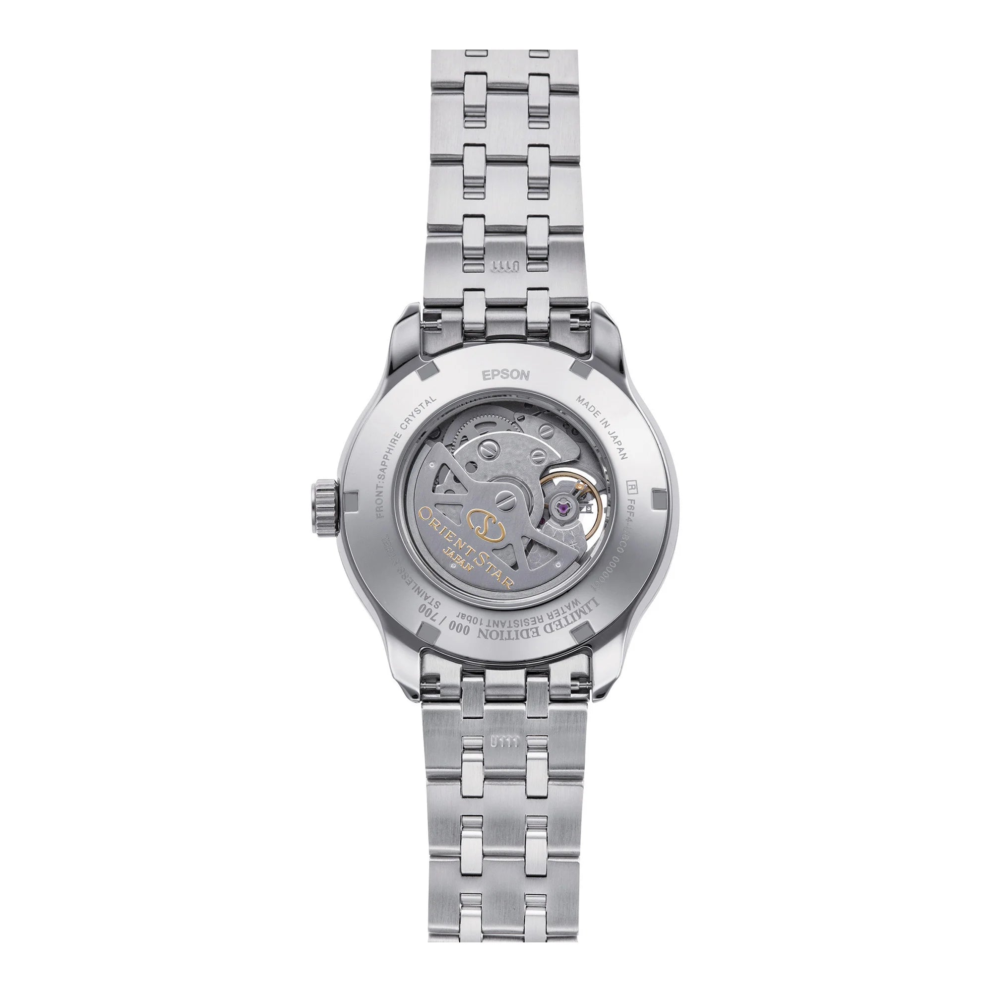 Struttura su più livelli mette in scena la meccanica: ponti e ruote emergono tra aperture geometriche, mentre la minuteria perimetrale e indici applicati mantengono ordine e leggibilità. L’indicatore di riserva di carica bilancia la scheletratura sul quadrante, creando simmetrie dinamiche. Finiture alternate e lavorazioni a raggiera amplificano i giochi di luce. Vetro zaffiro e fondello trasparente completano un carattere tecnico con spirito contemporaneo.