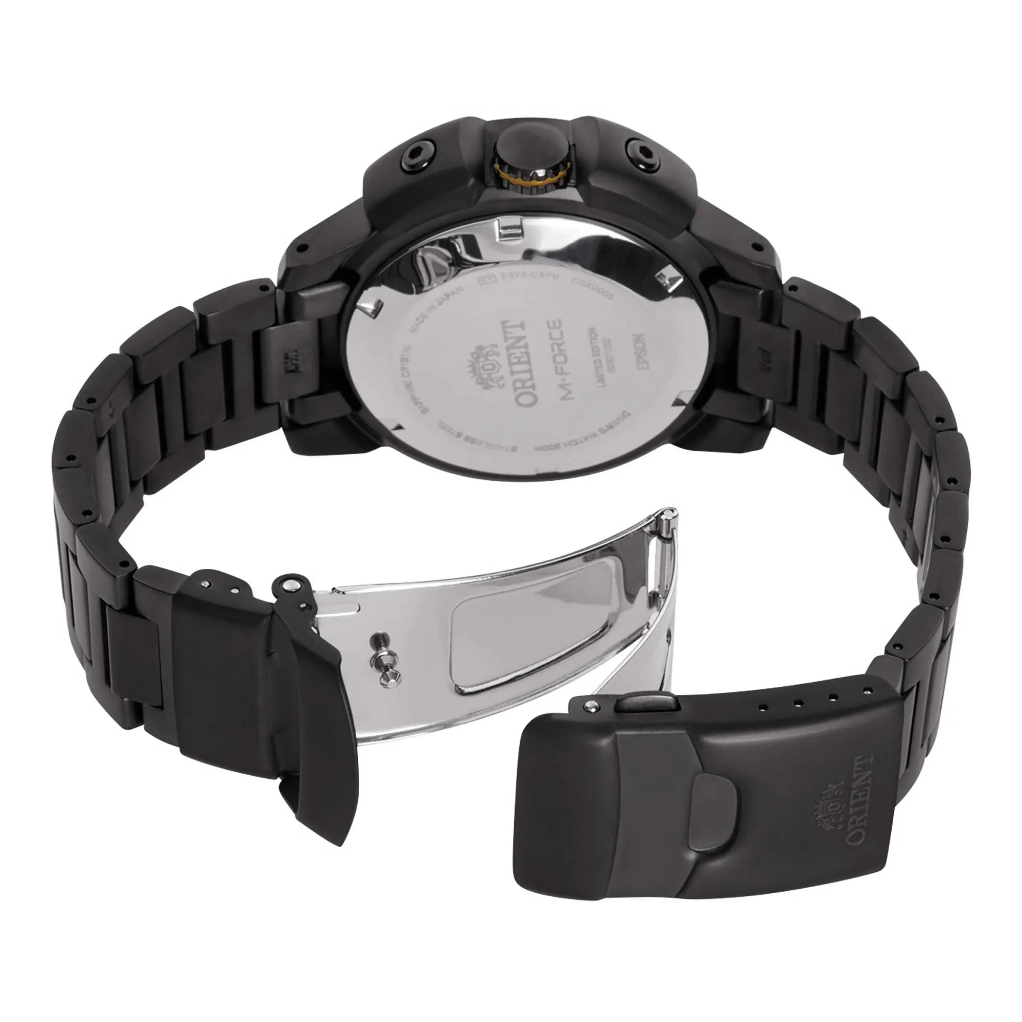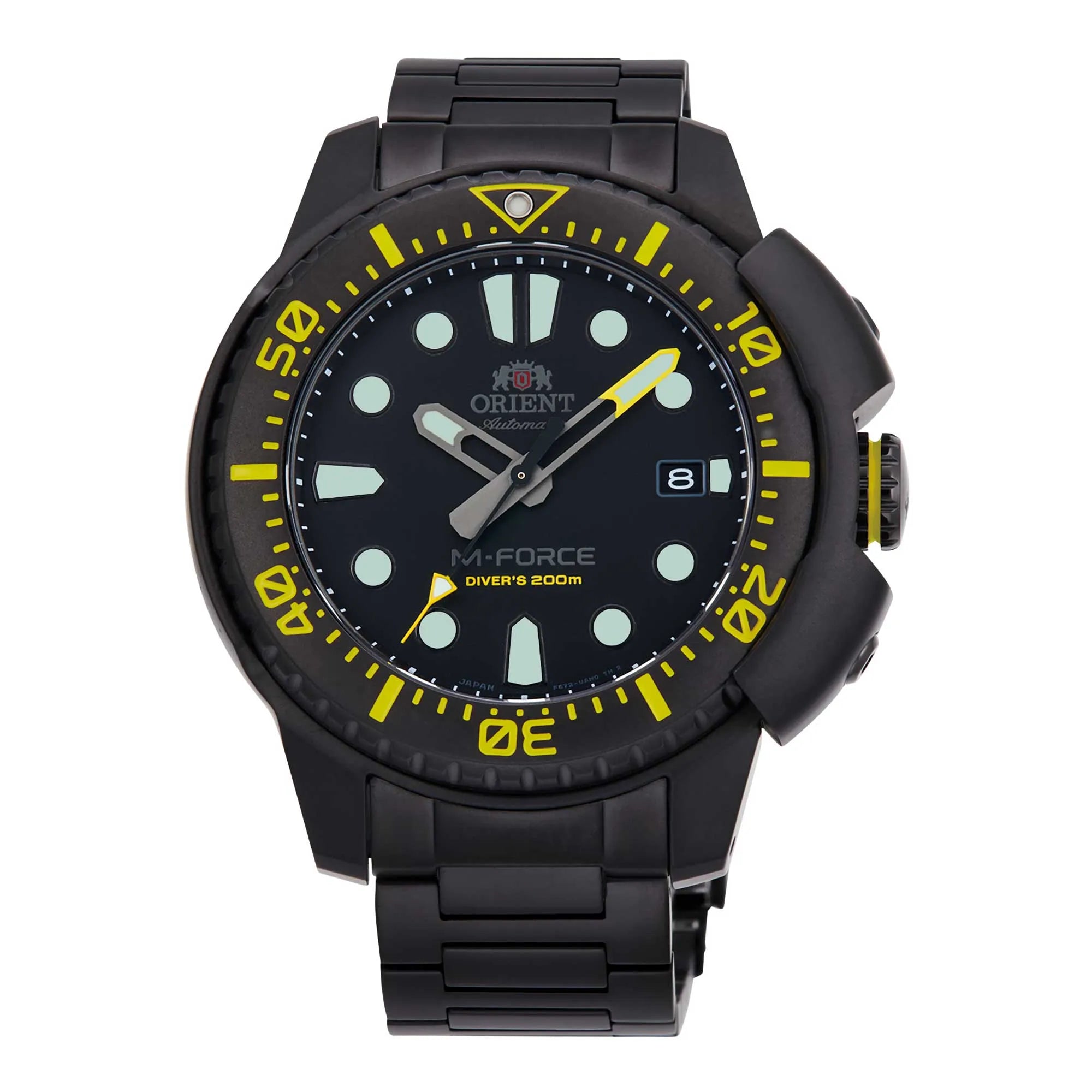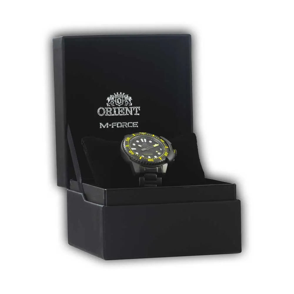 EDIZIONE LIMITATA RAIKOU ORIENT. 1.000 PEZZI PRODOTTI CON NUMERO DI SERIE UNIVOCO SUL FONDELLO. Giunta alla terza generazione di successi, la linea M-Force, interamente Japan Made, rappresenta l’anima guerriera della famiglia ORIENT Sport. Dal design quasi tridimensionale e d’impatto, questo modello impermeabile fino a 200 metri come da certificazione ISO non passerà inosservato al vostro polso. Comodo, ma pronto ad ogni sfida grazie alla robusta cassa in acciaio, al guscio che protegge da ogni avversità corona e ghiera e vetro zaffiro antiriflesso. Qui in Edizione Limitata nero notte con riferimenti di un giallo acceso, come un fulmine (Raikou in giapponese) nella notte.