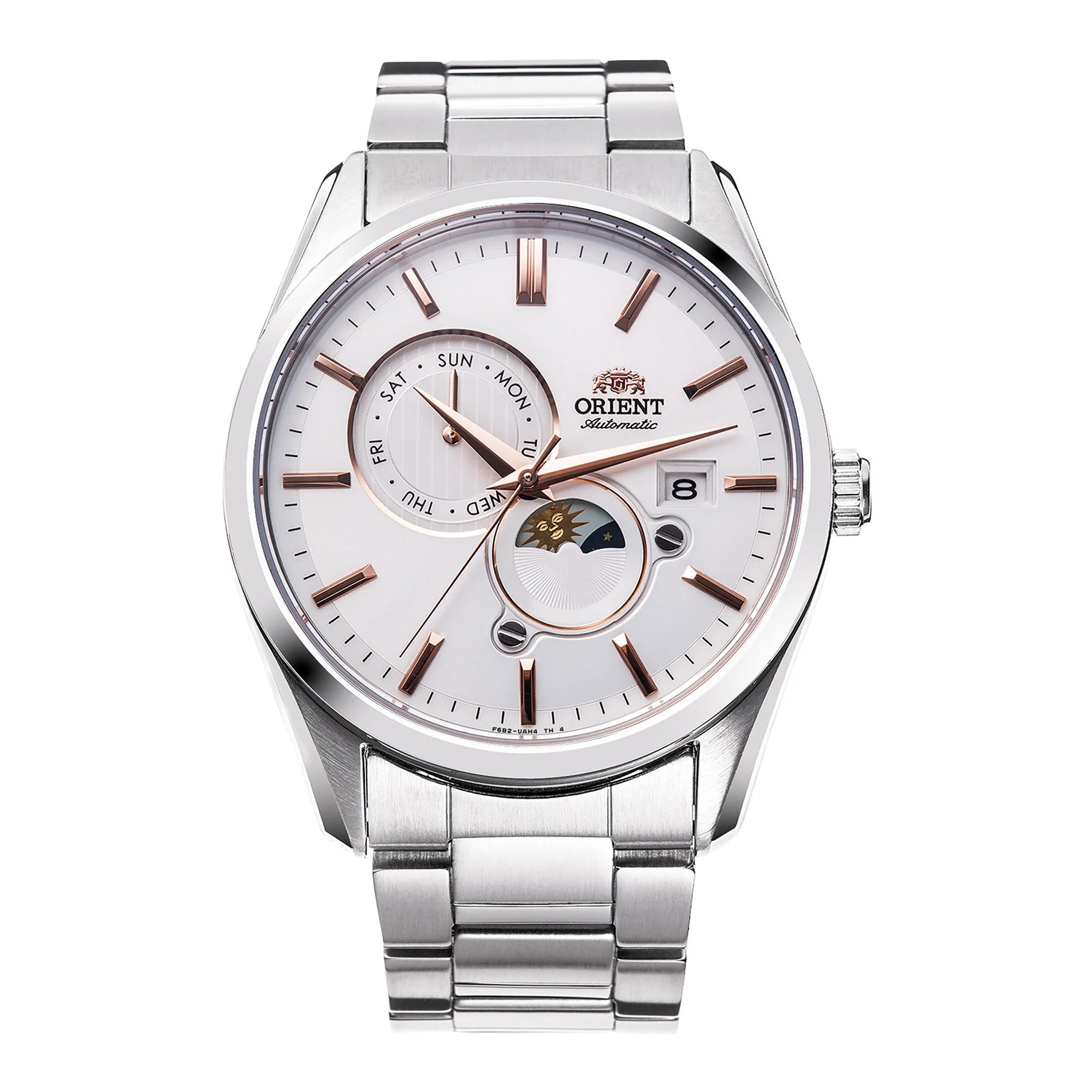 Complicazione giorno/notte al centro del progetto, con un disco illustrato che accompagna lo scorrere delle ore. Il quadrante adotta una disposizione a più contatori per data e giorno, mantenendo ordine e leggibilità. Indici applicati o numeri romani, minuteria precisa e sfere affusolate definiscono un linguaggio classico. Finiture radiali o sfumate aggiungono profondità, mentre cinturini in pelle e bracciale in acciaio ampliano le possibilità di abbinamento.